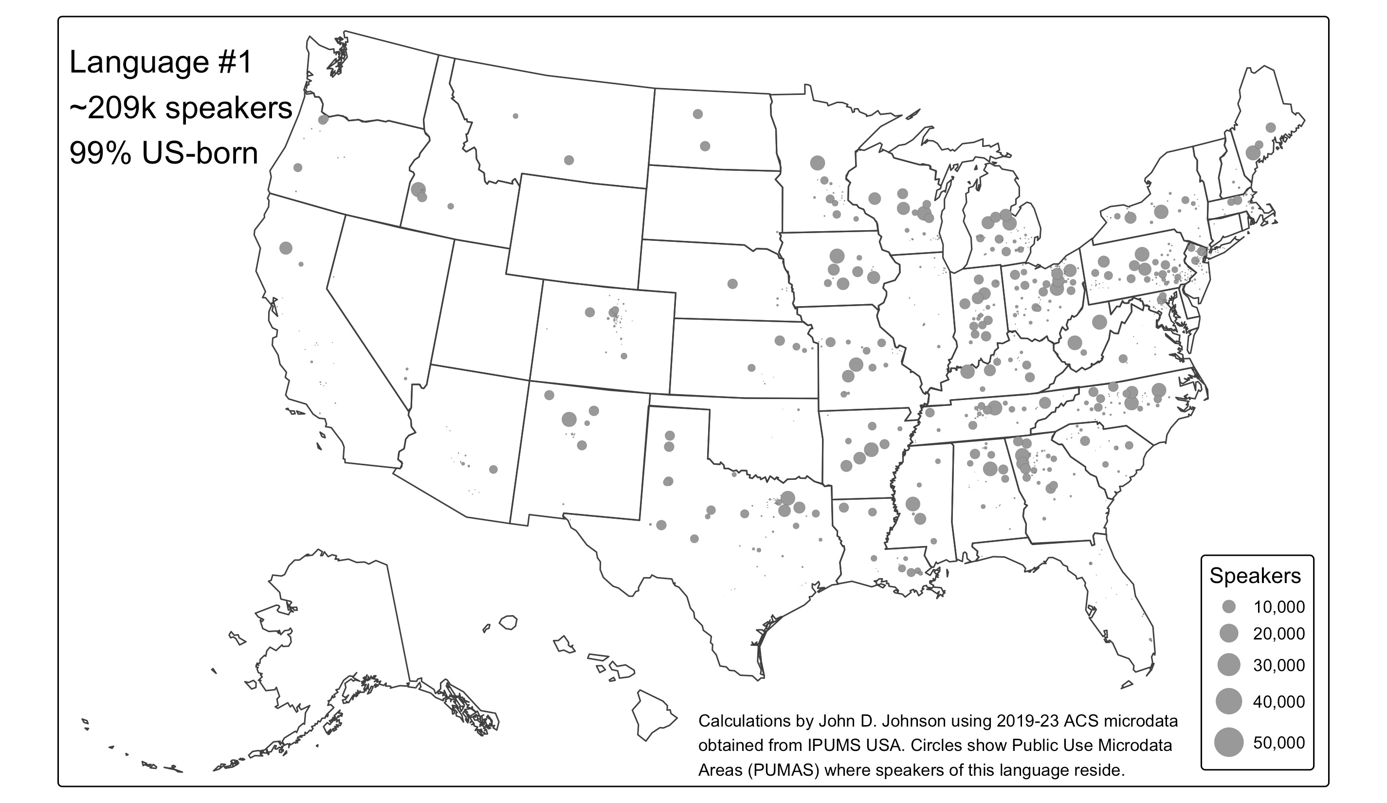 Notice how the two languages, despite having nearly identical numbers of speakers, follow extremely different spatial patterns. Language #1 is scattered across 218 communities of least 1,000 speakers, none of which hold more than 1.1% of the total number of speakers.1 Contrast that to Language #2, where only 25 places have at least 1,000 speakers. In fact, over 2/3rds of Language #2’s speakers live in just 10 communities, each with over 10,000 speakers. The largest has over 48,000.