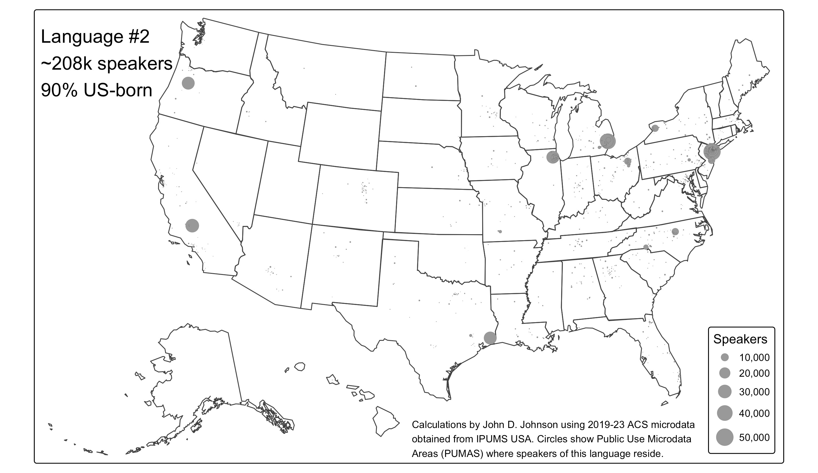 Can you guess what they are? When I’ve mentioned this to my friends, some of them guess the answer right away, but others never think of it. As a clue, I mapped where the speakers of each language live.
