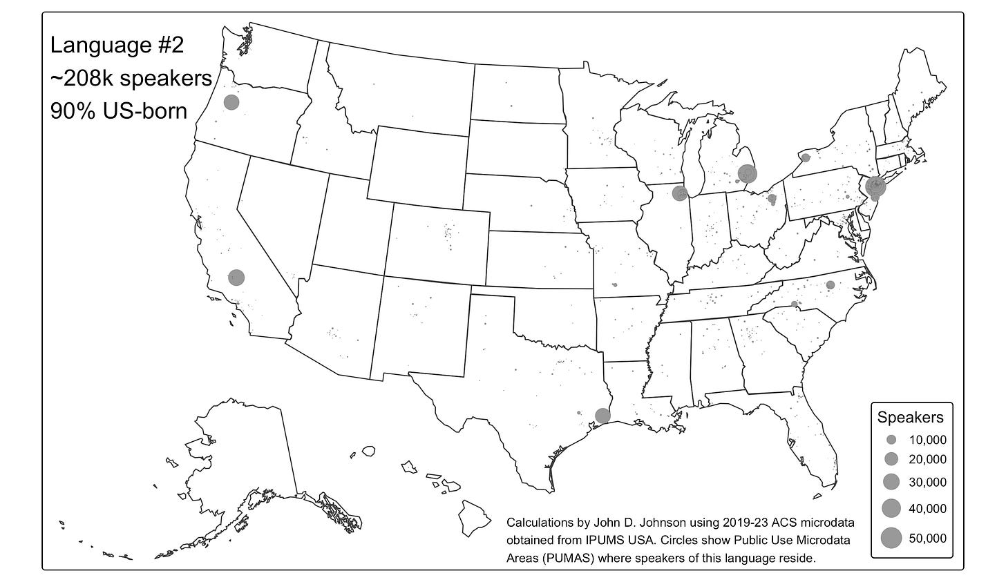 Super-interesting. I was guessing it would be Navajo and another indigenous language until I saw the maps. And I still didn't get them both right until the final clue about Germanic roots and religious communities. When I was growing up, Yiddish was still a language of immigrants, spoken by my grandparents and their generation. I didn't realize that American-born ultra-Orthodox communities were using it to this extent. And I had heard something about a resurgence, but I apparently missed this NPR story about its scope. https://www.npr.org/2025/04/22/nx-s1-5346733/yiddish-is-making-a-comeback